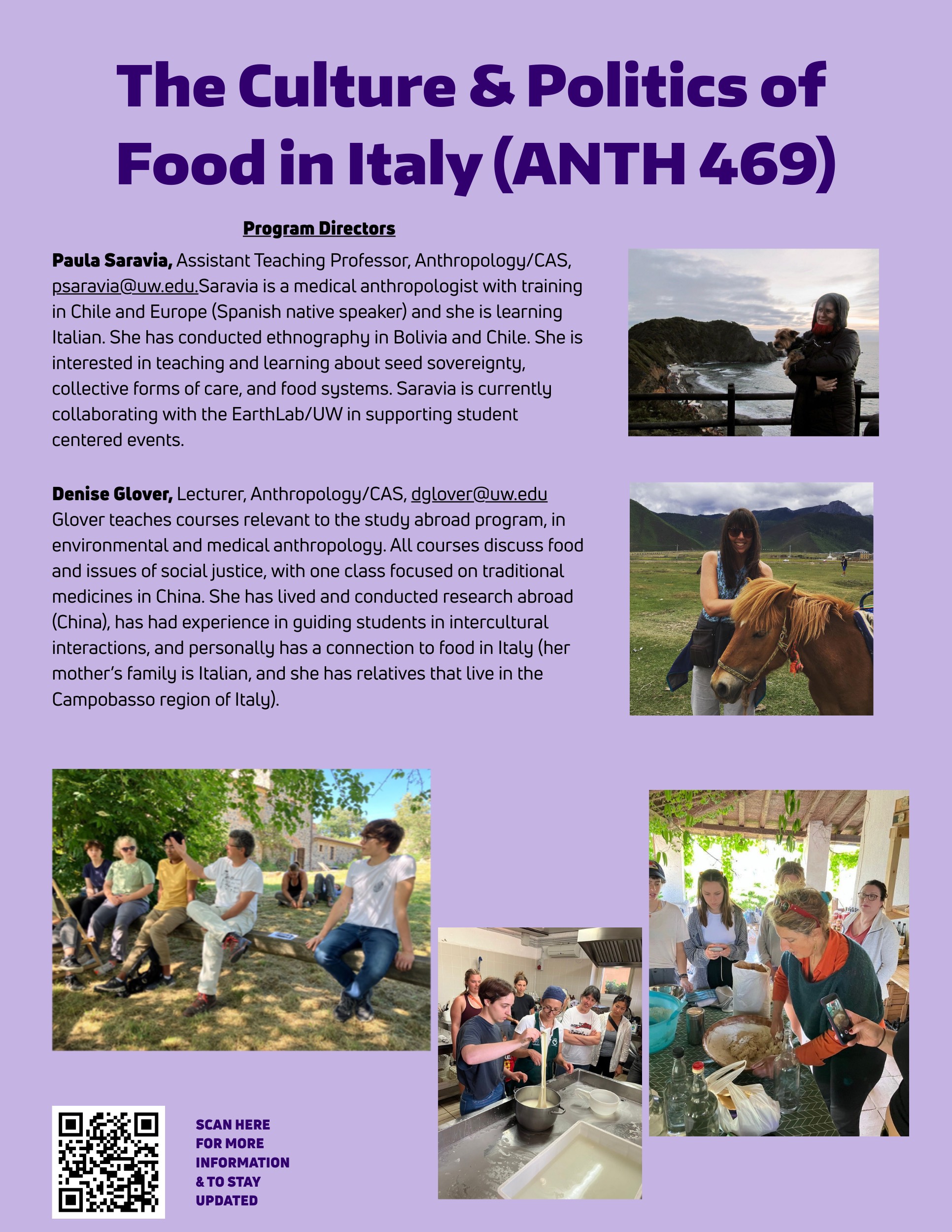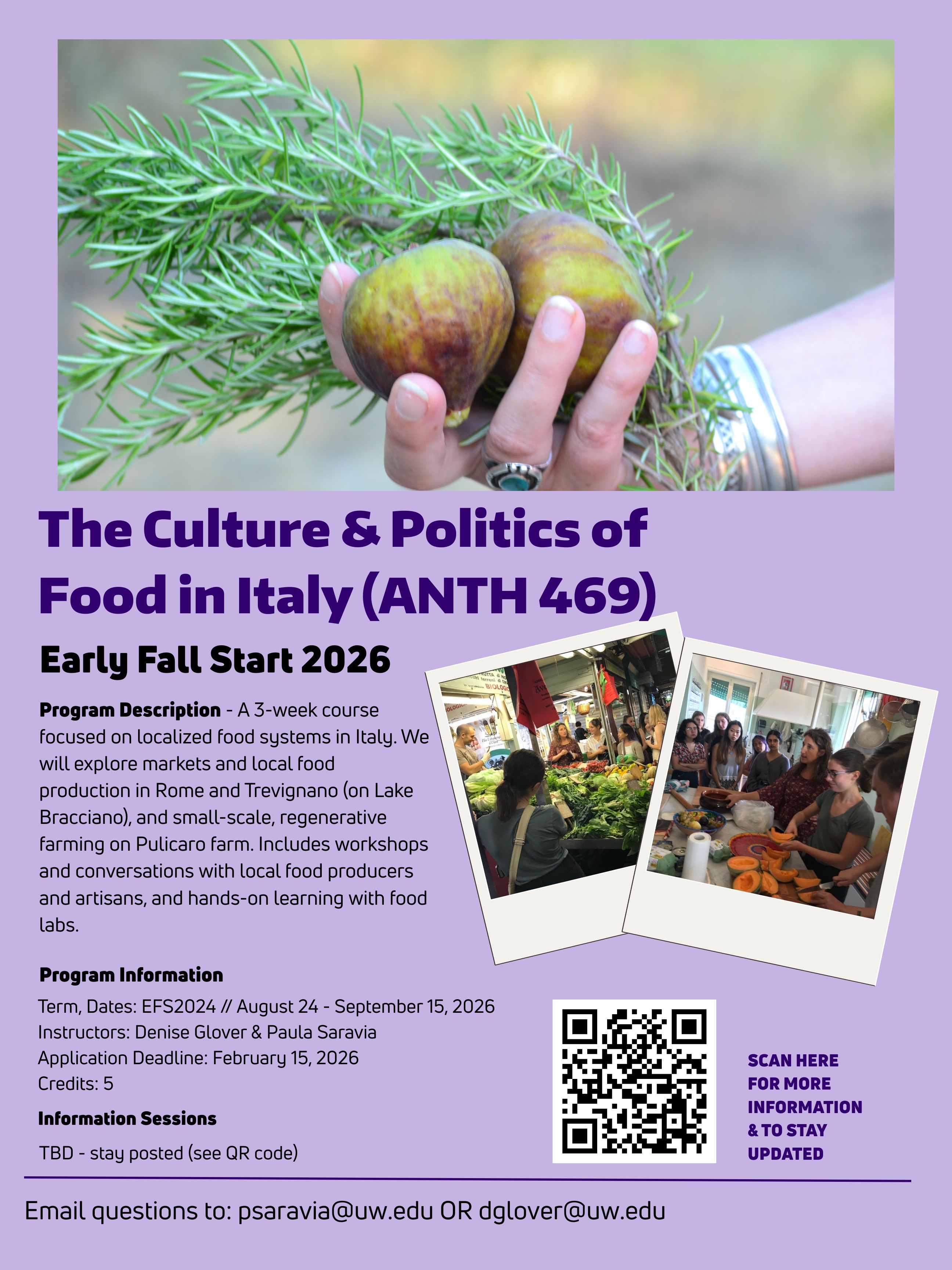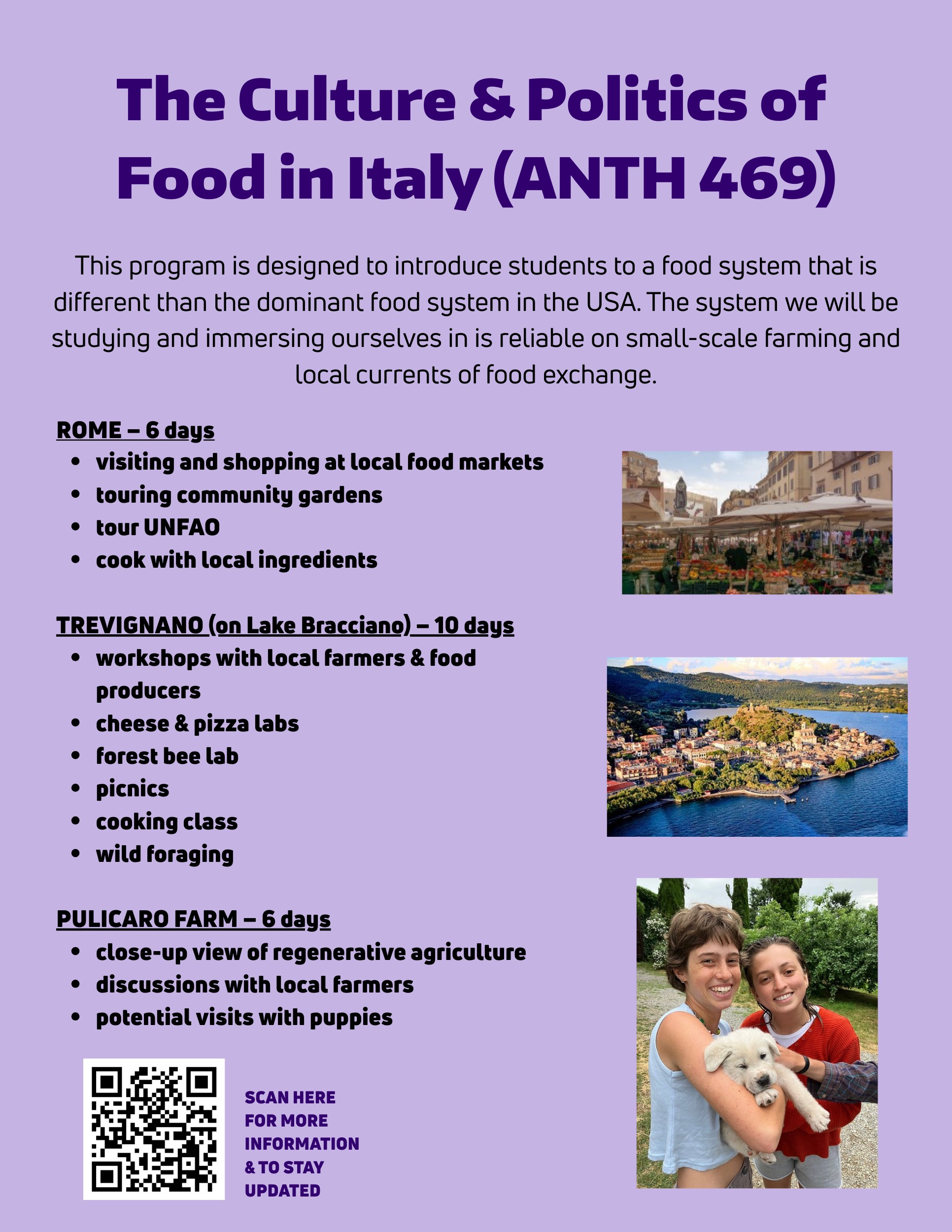Program Description – A 3-week course focused on localized food systems in Italy. We will explore markets and local food production in Rome and Trevignano (on Lake Bracciano), and small-scale, regenerative farming on Pulicaro Farm. Includes workshops and conversations with local food producers and artisans, and hands-on learning with food labs.